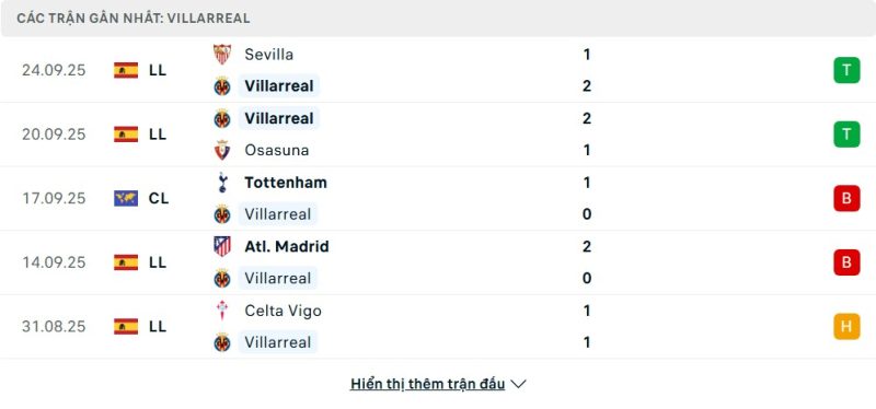 5 trận gần nhất của Villarreal: W-W-L-L-D