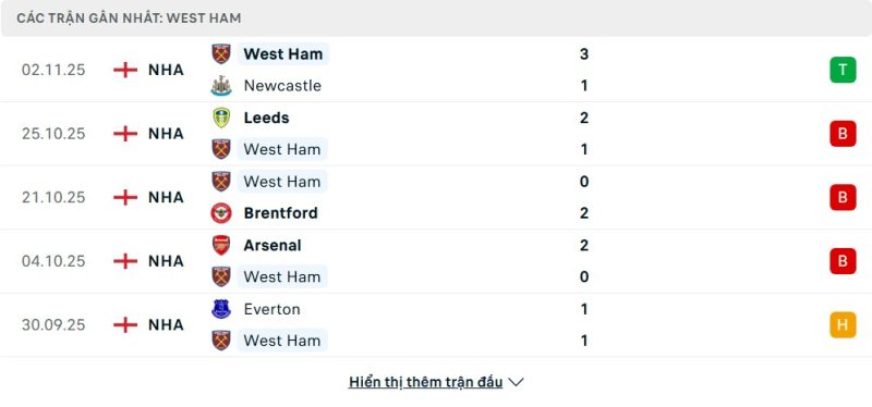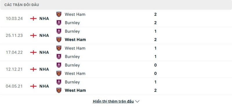 Thống kê phong độ gần đây West Ham United vs Burnley