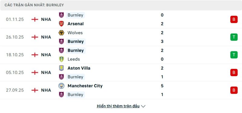 5 trận gần nhất của Burnley: L-W-W-L-L