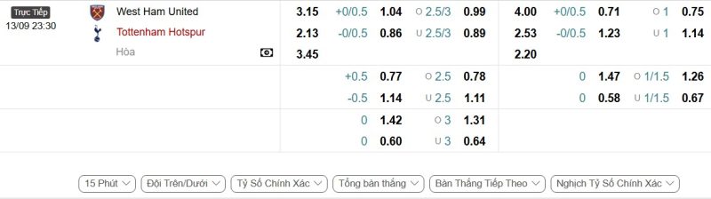 Bảng Tỷ lệ kèo bóng đá West Ham United vs Tottenham Hotspur