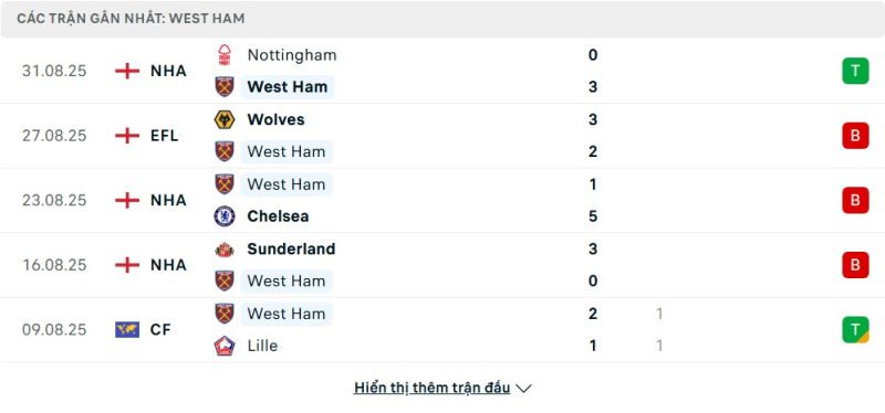 5 trận gần nhất của West Ham United: W-L-L-L-D