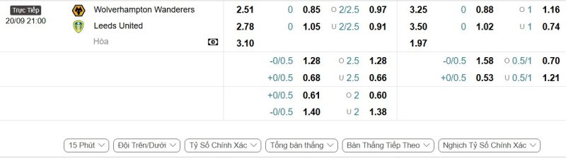 Bảng Tỷ lệ kèo bóng đá Wolverhampton Wanderers vs Leeds United