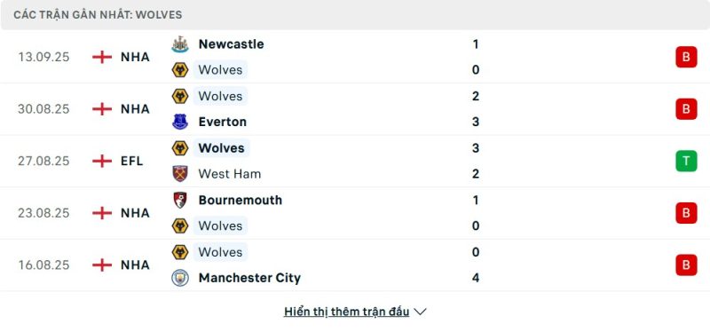 5 trận gần nhất của Wolverhampton Wanderers: L-L-W-L-L
