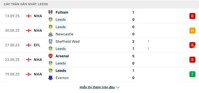 5 trận gần nhất của Leeds United: L-D-D-L-W
