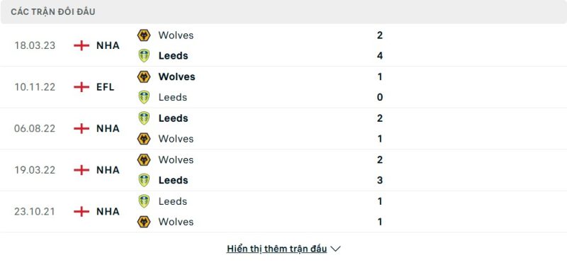 Thành tích đối đầu của Wolverhampton Wanderers vs Leeds United